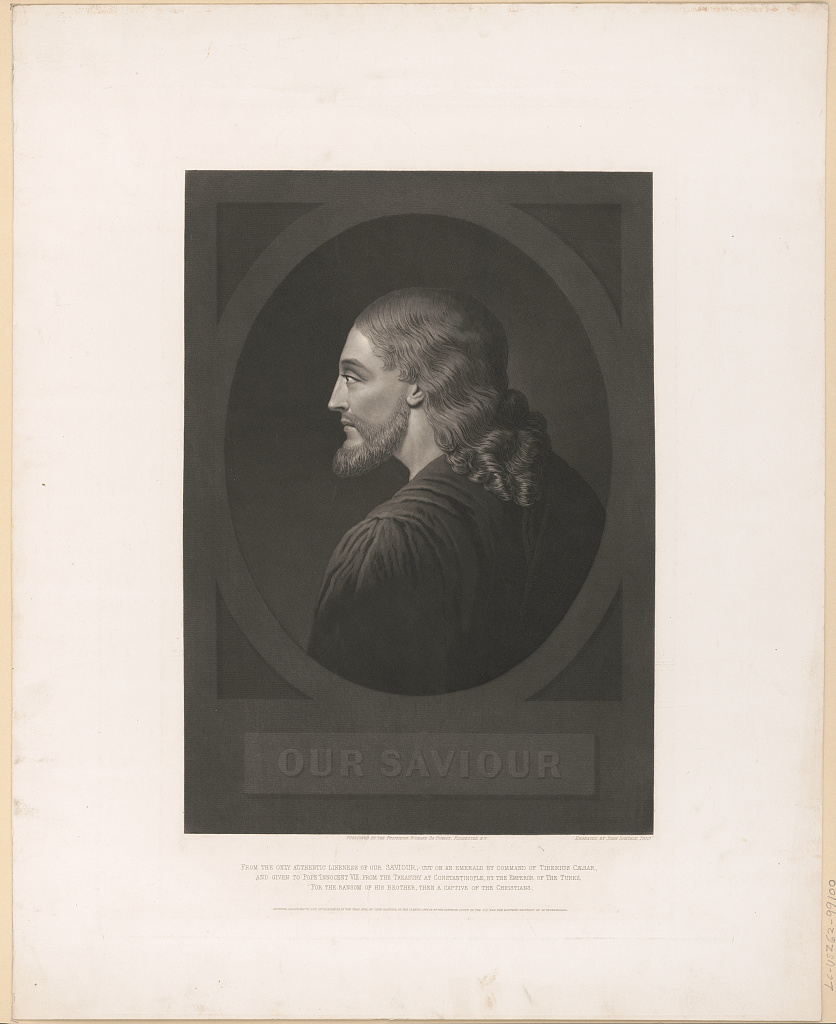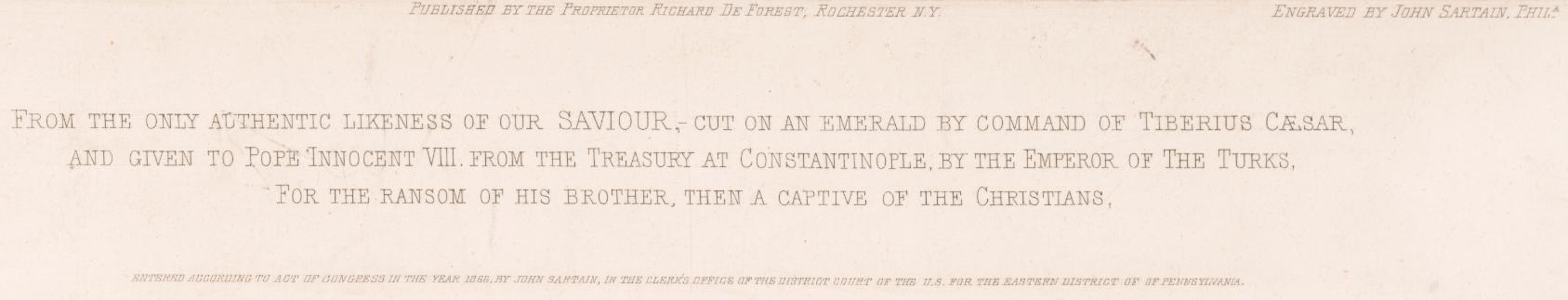 Gambar ini direproduksi oleh ukiran John Sartain “Our Saviour” yang pertama kali diterbitkan oleh Richard De Forest, Rochester, NY, dan L.W. Carr, Detroit, MI dan masuk sesuai dengan Undang-Undang Kongres pada tahun 1865.